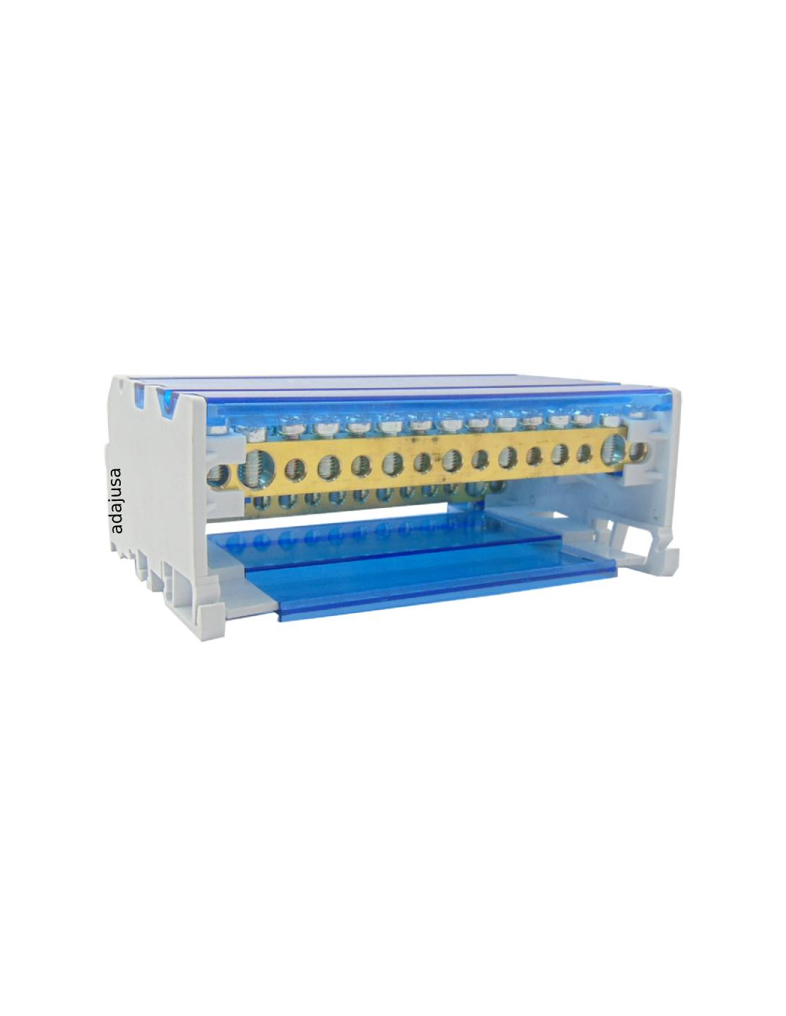 Four-pole (3 poles + neutral) electrical distribution board with 13 outputs and 2 inputs, suitable for currents up to 100A, terminals made of brass with steel screws on polyamide support and protected with polycarbonate cover. Screw mounting on panel or DIN rail. Compact size.